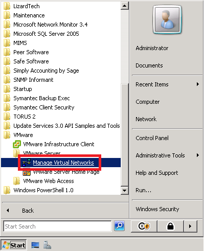 In the Start Menu, under VMWare, open “Manage Virtual Networks”.